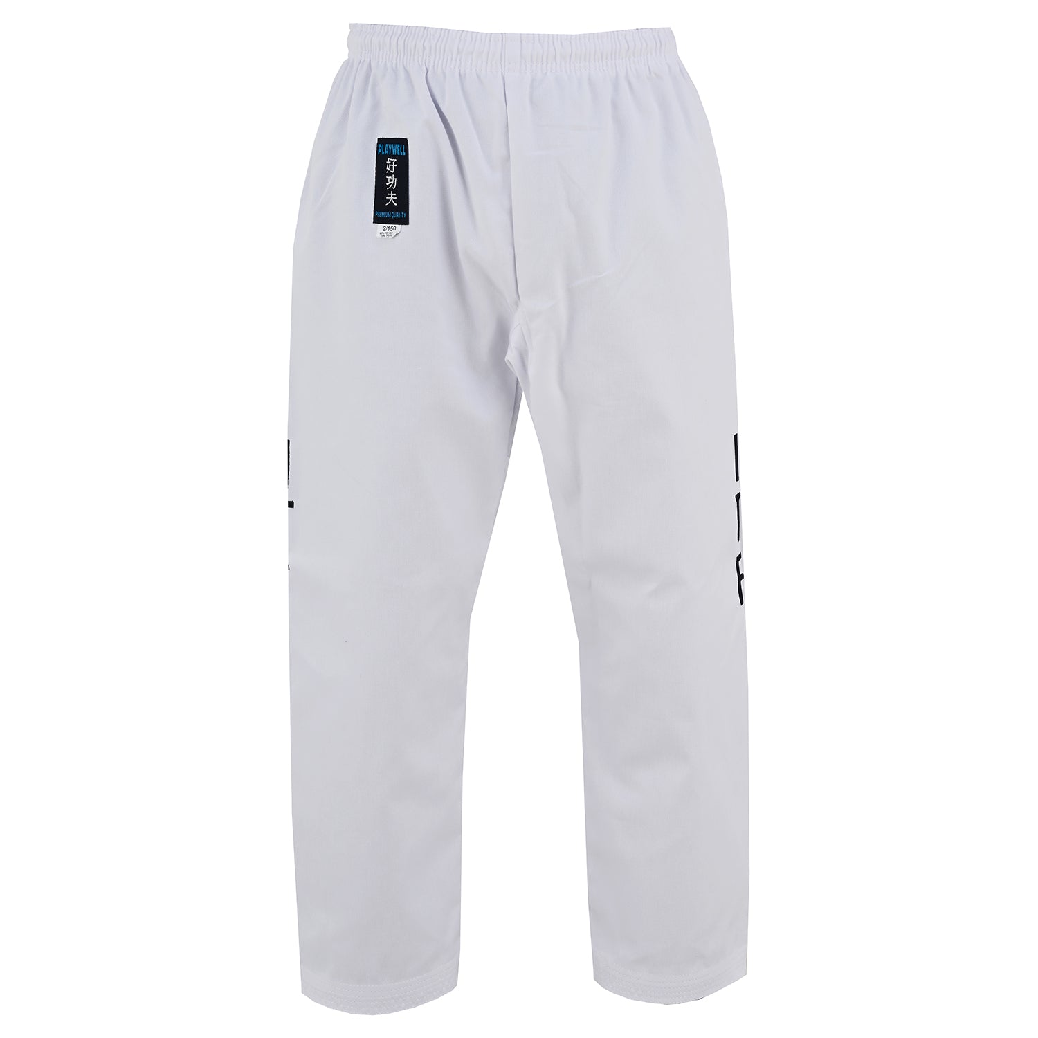 Made of Polycotton 65/35 .ITF style with quality velcro closure and the back is fully embroidered with international Taekwondo in english and Korean. Trousers have elastic/cord waist and both legs have embroidered ITF.