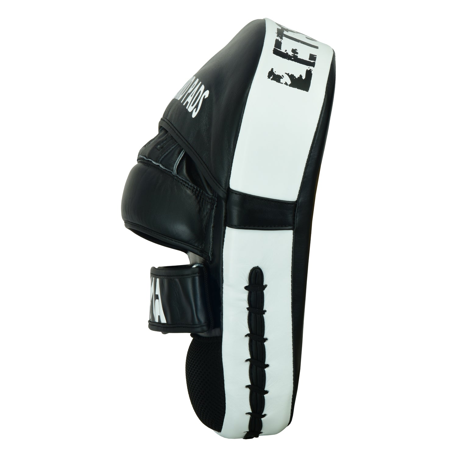 New in the Market, Made from Genuine Cowhide Leather, Hybrid Focus Pads, Offering The Size of a Thai Pad, But with the Design of Focus Pad, Their firm, high-density foam padding enhances the balance between proper technique and shock absorption. These large, heavy-duty mitts will withstand the punishment that world-class strikers dish out. They feature a Velcro enclosure around the wrist to prevent slipping and maintain a simple fit that can easily be adjusted and moved. This also assists in quickly putting the mitts on and taking them off between training transitions. The additional padding, covered fingers and hand area provide the best possible protection. The safety cushion on the back allows for a great elbow and hand workout; this is also ideal for knee techniques. In addition, these large punching mitts can be used for heavy punching power drills, speed kicking drills, and accuracy kicking drills.