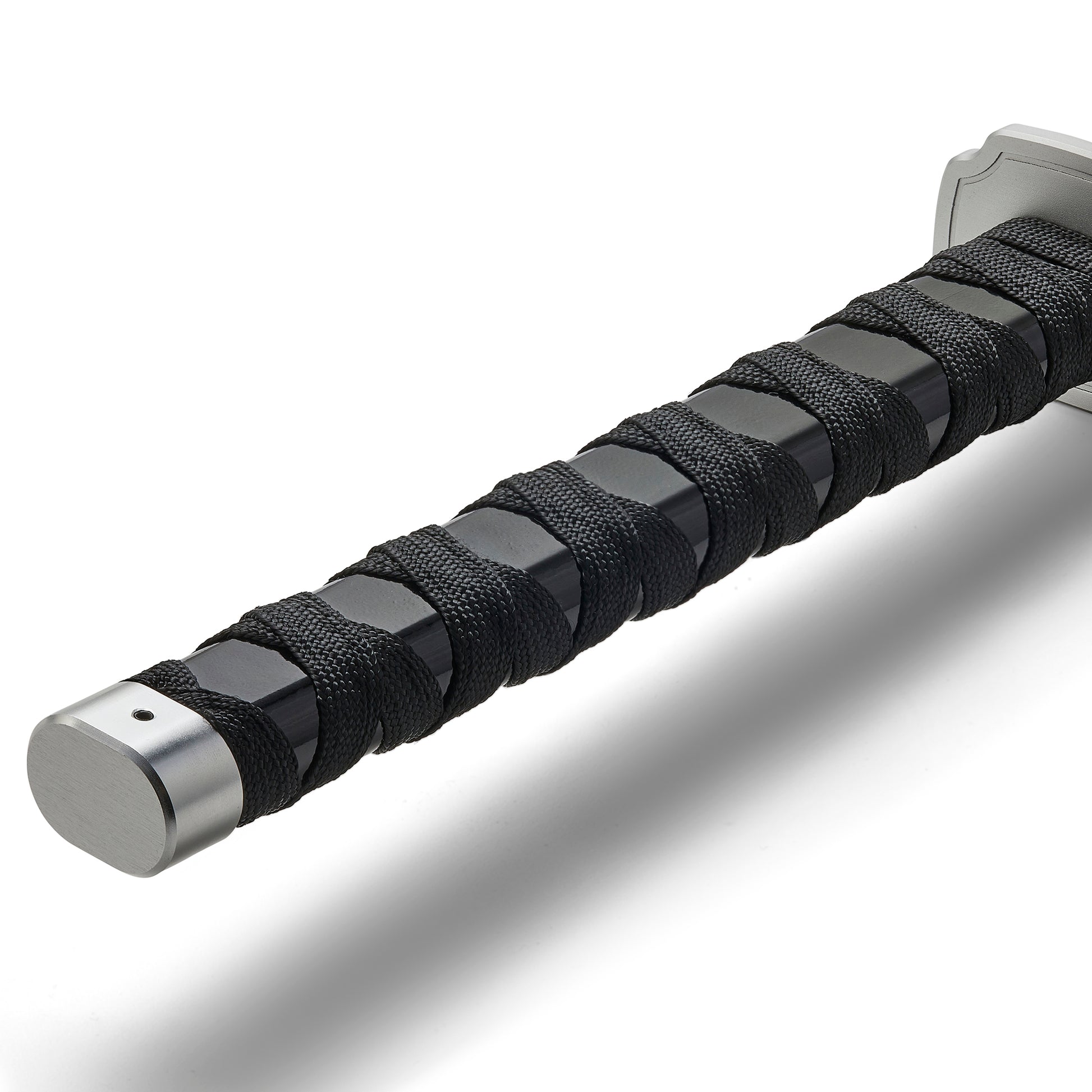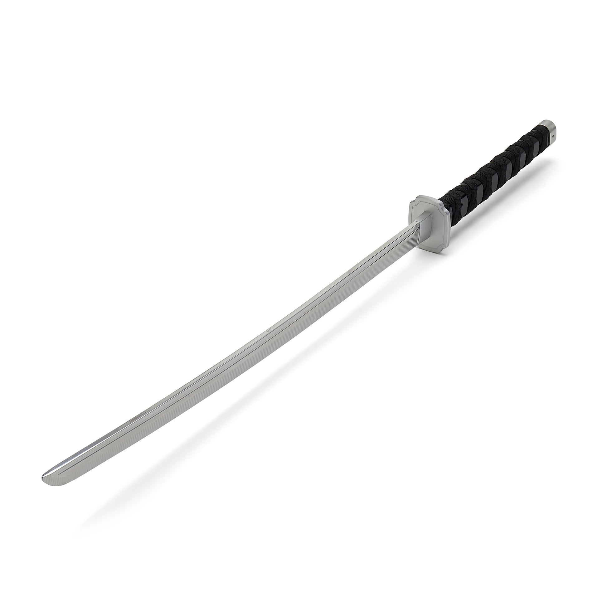 The rectangular aluminum hand guard has a satin finish. Half tang construction. Blade is not sharpened. However has a serated Edged Blade Design for a more Authentic Look.