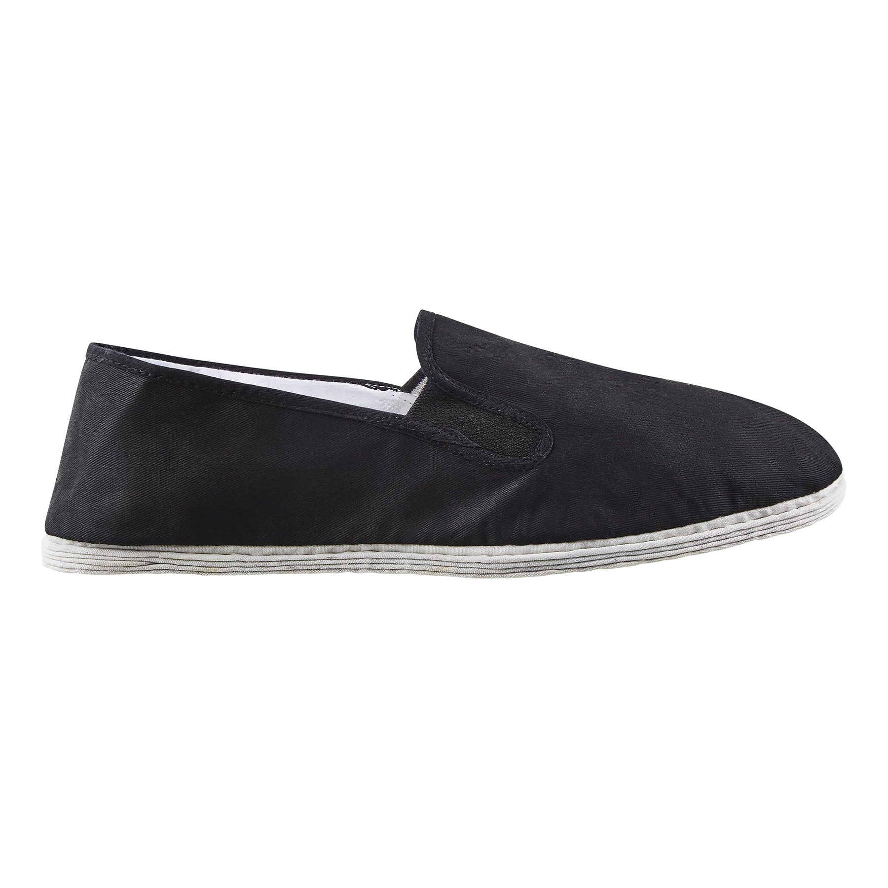 Traditional Kung Fu slippers made of black canvas, Soft outer white sole with multi rows of stitching. Also has white stitched inner lining.