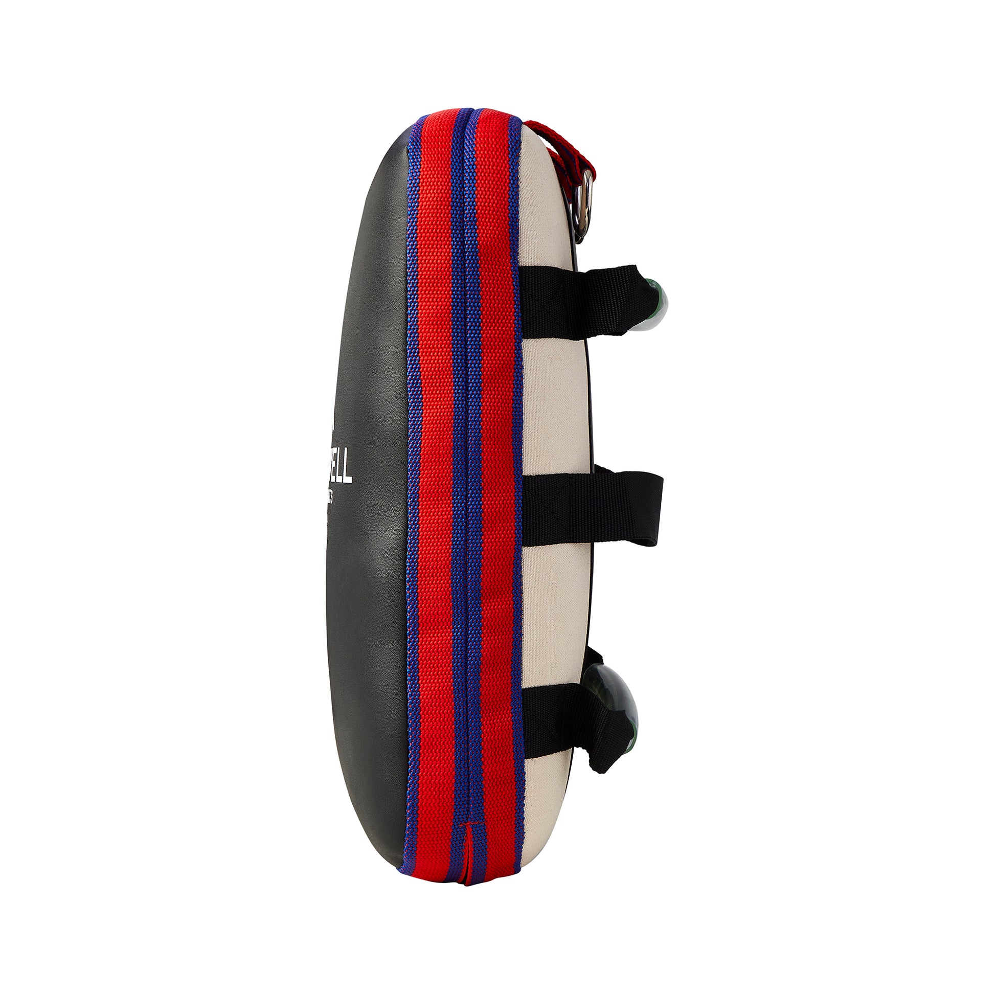 Playwell kicking shields are tough enough to take a major beating day after day. Heavy duty strapping to hold vertical or horizontal. Can be held left or right handed. Size: 18.5x9.5x3.5. Canvas.