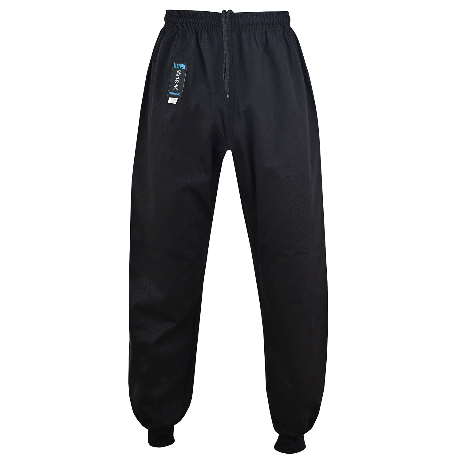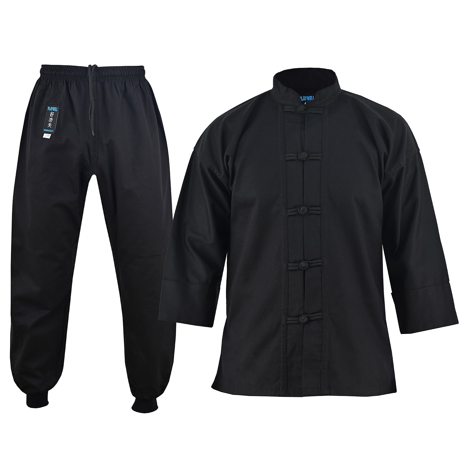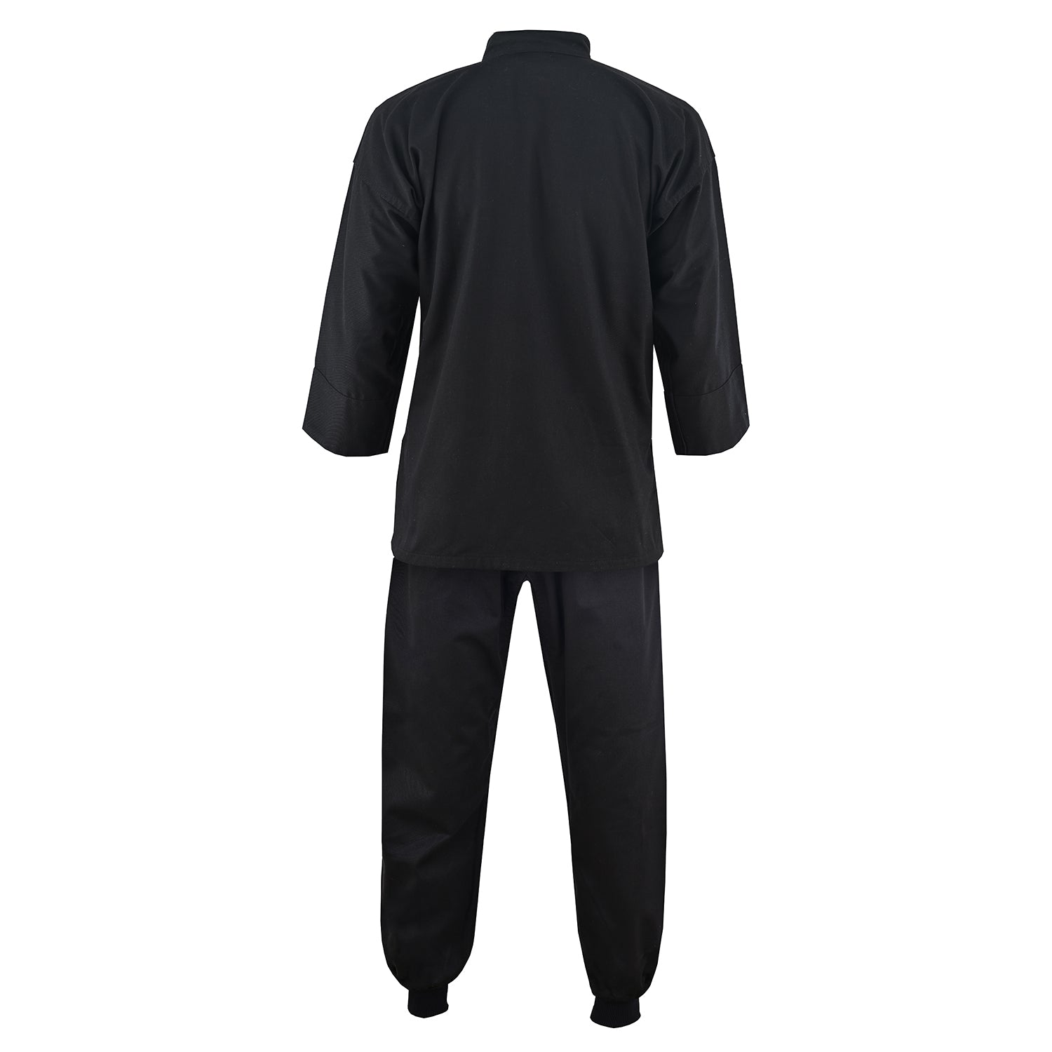 Medium Weight Kung Fu suit. Black. Black Cuffs and Toggle Fasteners to Jackets. 100% Cotton.Kung Fu Trousers with Elastic and Cord Waist and Elasticated Ankle for all sizes. Excellent Kung Fu Uniform made with the finest bleached cotton. Traditional outfit.