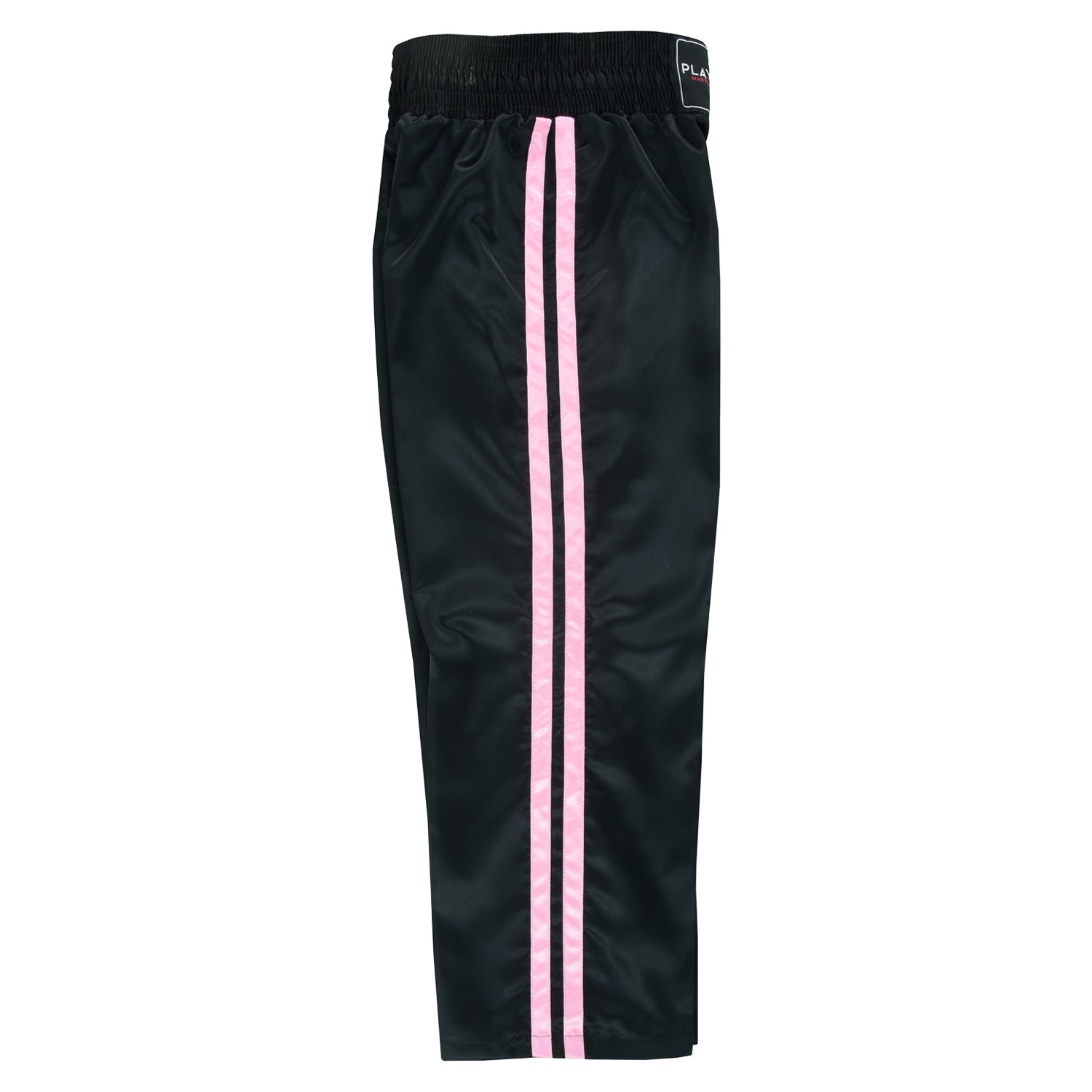 Black Satin Kickboxing Pants, Made from High Quality Satin, Black Pants with 2 Contrasting Stripes on both Sides, 3 Inch Pro Waist Band,